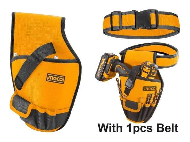 Tamaño: L290 × W190mmCon cinturón de 1 piezaMaterial: polieste 600DCarga máxima: 8 kg1 bolsillo grande para taladro inalámbrico.5 bolsillos delanteros para brocas y tornillos